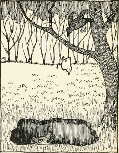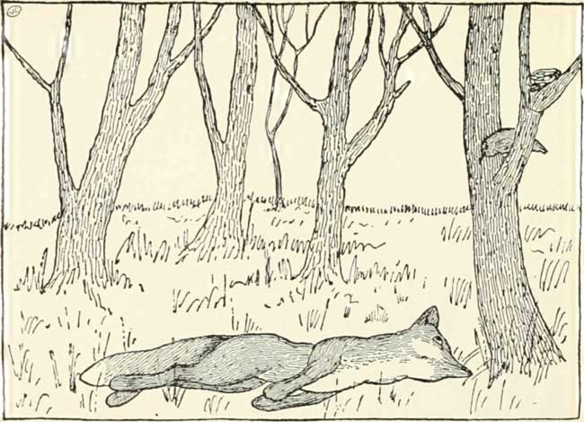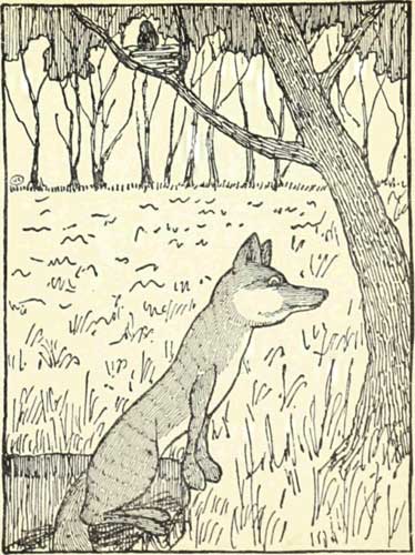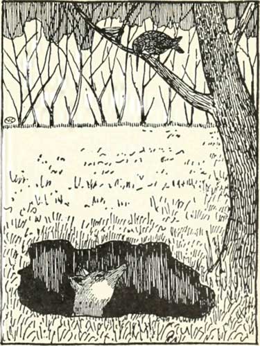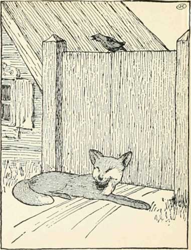 fox climbed up on to the sticks and out of the hole.   And when he had climbed out, he lay down right under the tree. And there he lay and lay, and he said to the blackbird: “Look here, you fed me, didn't you, Mr. Blackbird?”   And the blackbird answered. “Yes.” “And you got me