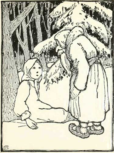 loose such cold, that you could hear the air creaking.   Then he asked her again: “Well, little girl, are you warm now?” And she answered: “Yes, King Frost!”   And when he saw that she was a good girl, he felt sorry for her. So he put on